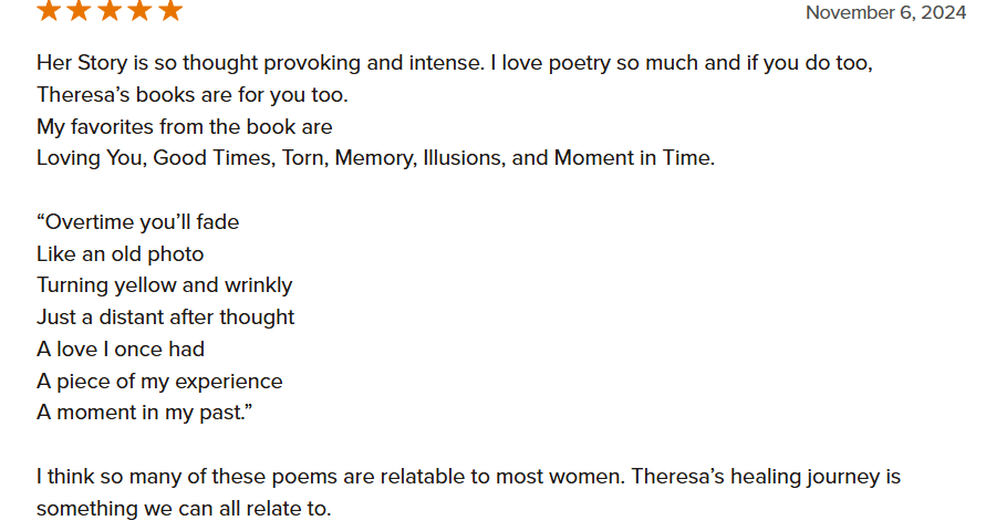 The pain in her heart paralyzed her. Emotionally and physically, she suffered. She tried to forget, but the tears dropped. Everyone told her it's the process. With time, she’d heal. But she was impatient. Writing became her muse, and she poured her heart out on paper. Each entry, each word, brought her closer to recovery. The hardest part was admitting the truth. She, like so many, fell for a narcissist. After years of verbal and emotional abuse, Theresa found the courage to say goodbye. This is her story told in poetry.