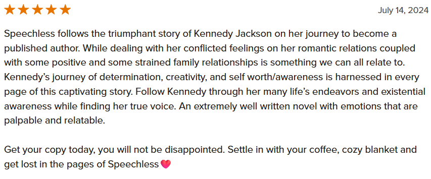 Kennedy Jackson is an aspiring writer striving to become a published author. However, her romantic life is in shambles, and she is at a loss for words. As her dreams draw closer to becoming a reality, her beliefs about intimacy are challenged, and she must explore all forms of love, including self-love. Her young adult novel follows the journey of Teagan, a fictional character who symbolizes Kennedy's own experiences and struggles. They use poetry and self-reflection to see their self-worth and pursue their purpose.